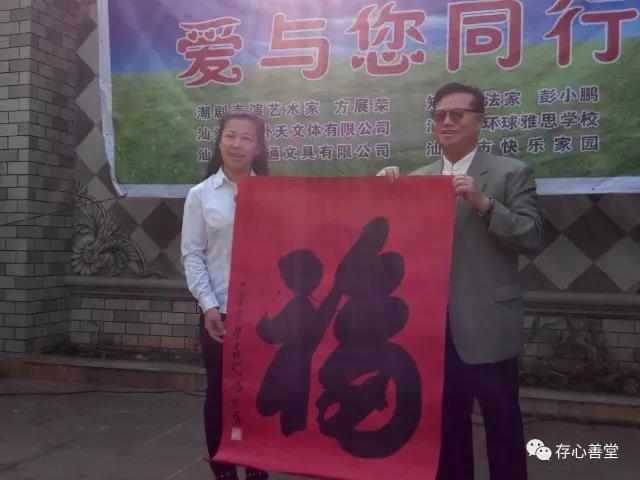 共迎新春,为老人、儿童送福。1月8日上午,存心养老院举行了“爱与您同行”慰问老人公益活动,活动由汕头市天外天文体有限公司、喜通文具有限公司、环球雅思汕头学校和大潮汕粤东分会联合主办,邀请艺术家和书法家现场为老人们献艺,存心慈善会党支部吴宏文书记、存心慈善会颜木和顾问、翁妙华院长接待了嘉宾和问候老人们,同时爱心企业还慰问存心儿童教养院的孩子和存心庇护安养院的老人。知名书法家彭小鹏先生为存心养老院送来了书法作品《福》,祝愿老人们幸福安康;著名表演艺术家方展荣和张桂坤表演了潮剧《王茂生进酒》选段《饮水思源》;潮乐传承中心演员孙志武表演了快板《夸家乡》,著名潮剧老生张桂坤表演了《飞龙女》选段《执法如山》,市潮剧团演员李素武演唱《蒋兴哥休妻》,碧华学校李晓端老师为大家歌唱《好人就在身边》,大家共同为老人们献出了精彩纷呈的节目。嘉宾们为老人、儿童们带来了过冬的帽子、手套、围巾及各类食品,与老人们欢聚一堂。志愿者们将各种饮料和食品送到老人们的手中,并请来厨师为老人、儿童做上精美午餐并陪伴老人们共进午餐。