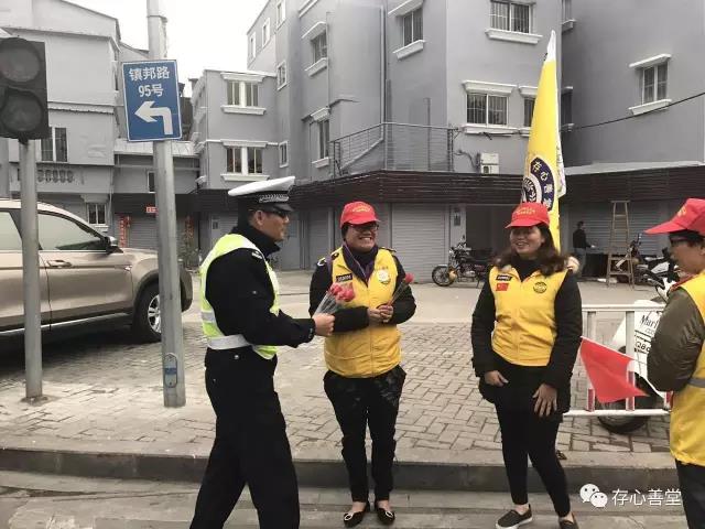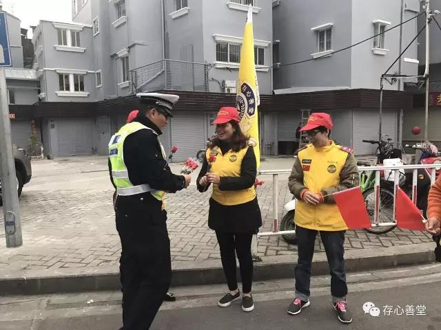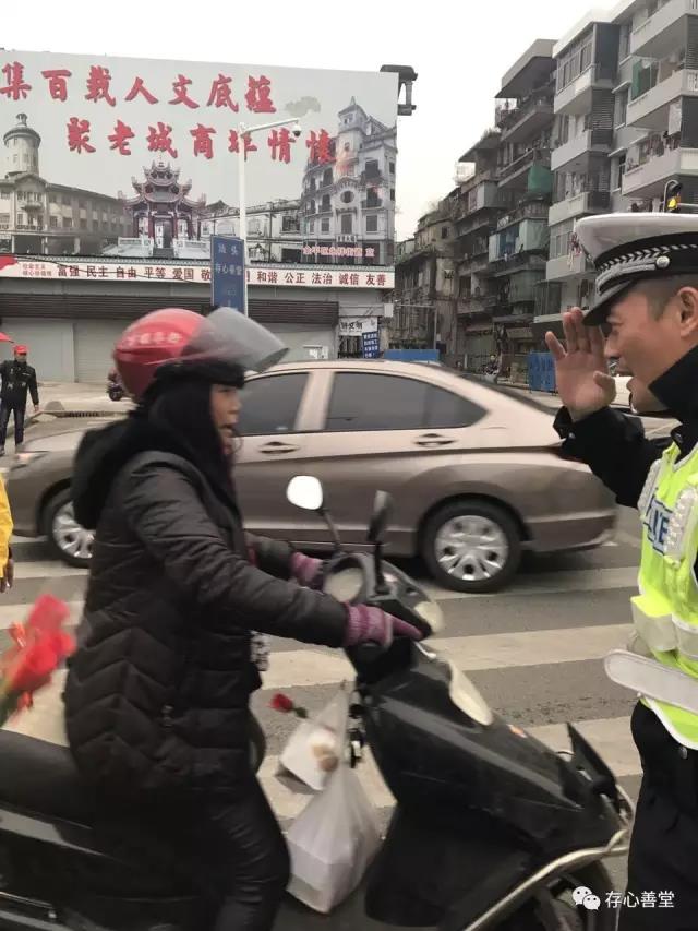 3月8日是三八国际妇女节,存心同力服务队的女义工们走上街头,前往西堤安平路等路口,协助交警维护交通。金平交警四中队罗宏辉副中队长慰问了女义工们,为她们送上鲜花,以示感谢,并向有戴头盔的女摩托驾驶员送上鲜花,为她们遵守交通法规法则点赞,让大家过一个有意义的三八妇女节。