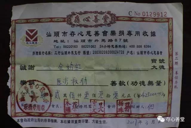 19岁的金娇虹是澄海区盐鸿镇人,去年,刚中专毕业一年在某医院当护士的她,患上了急性髓性白血病。这对于一个普通的农村家庭来说,简直是晴天霹雳。为了挽救她的生命,金娇虹一家倾尽所有,能借的钱都借了,亲戚朋友和她同事能接济的也接济了,然而,在巨额的医疗费用面前,这些还是远远不够。不得已,她的家人通过多种渠道,向社会求助,并承诺铭记每一份爱心,善款全部用作金娇虹的医疗救助。遗憾的是,金钱没能挽回这条年轻的生命,春节前夕,金娇虹不幸离世。根据她的生前遗愿,她的家人委托存心慈善会,将她治病剩余的42.5万元爱心款,悉数捐赠给存心慈善会,由存心慈善会将善款用于救助11个机构及个人,让爱心延续下去。