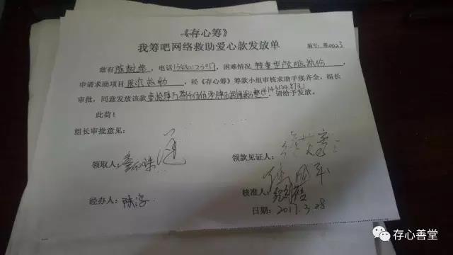 陈树绵,46岁,住汕头金平区于2017年3月13日在作业过程中不慎从3米多高的梯竹梯上跌落,造成特重型颅脑损伤,家中还有一个一级残疾的儿子,两位80多岁高龄的父母需要照顾,无力支付高昂的治疗费用,只好向存心善堂救助,善堂获息后当天马上为垫付5000元急救资金后其发起存心筹筹款,只用短短6天共筹得143504.87元。(壹拾肆万叁仠伍百多元)。3月28日上午,存心筹爱心使者小组徐英家豪组长、陈长强、陈国平副组长将社会热心人捐赠的全额善款送到陈树绵家人手上。存心在行动,有困难找存心,我们就在你身边。